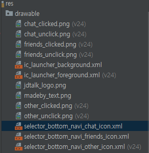 오른쪽과 사진 같이 /drawable에 클릭하기 전/후의 Icon Image와 해당 Image를 논리적으로 클릭하기 전/후로 나눠 줄 icon.xml을 생성한다.