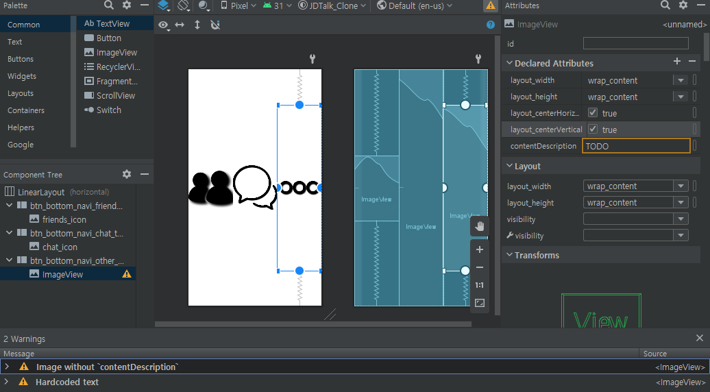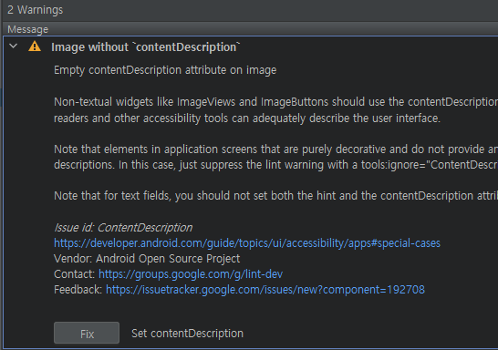 .xml에서 [Design] 탭의 속성에서 해당 ImageView의 [contentDescription]을 작성하면 모든 문제가 해결된다.