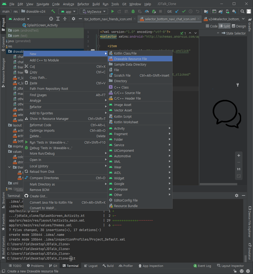 위에 생성한 selector.xml은 아래와 같이 [ New ] ▶ [ Drawable Resource File ] 로 생성할 수 있다.