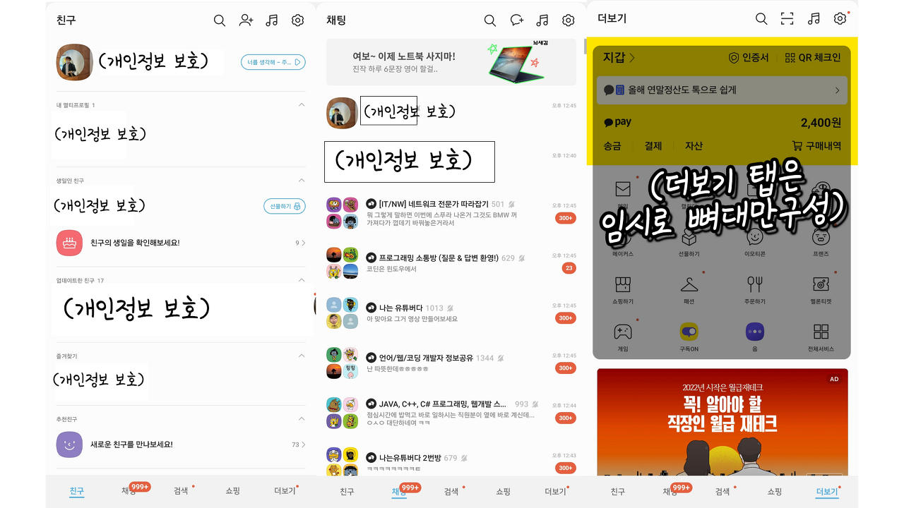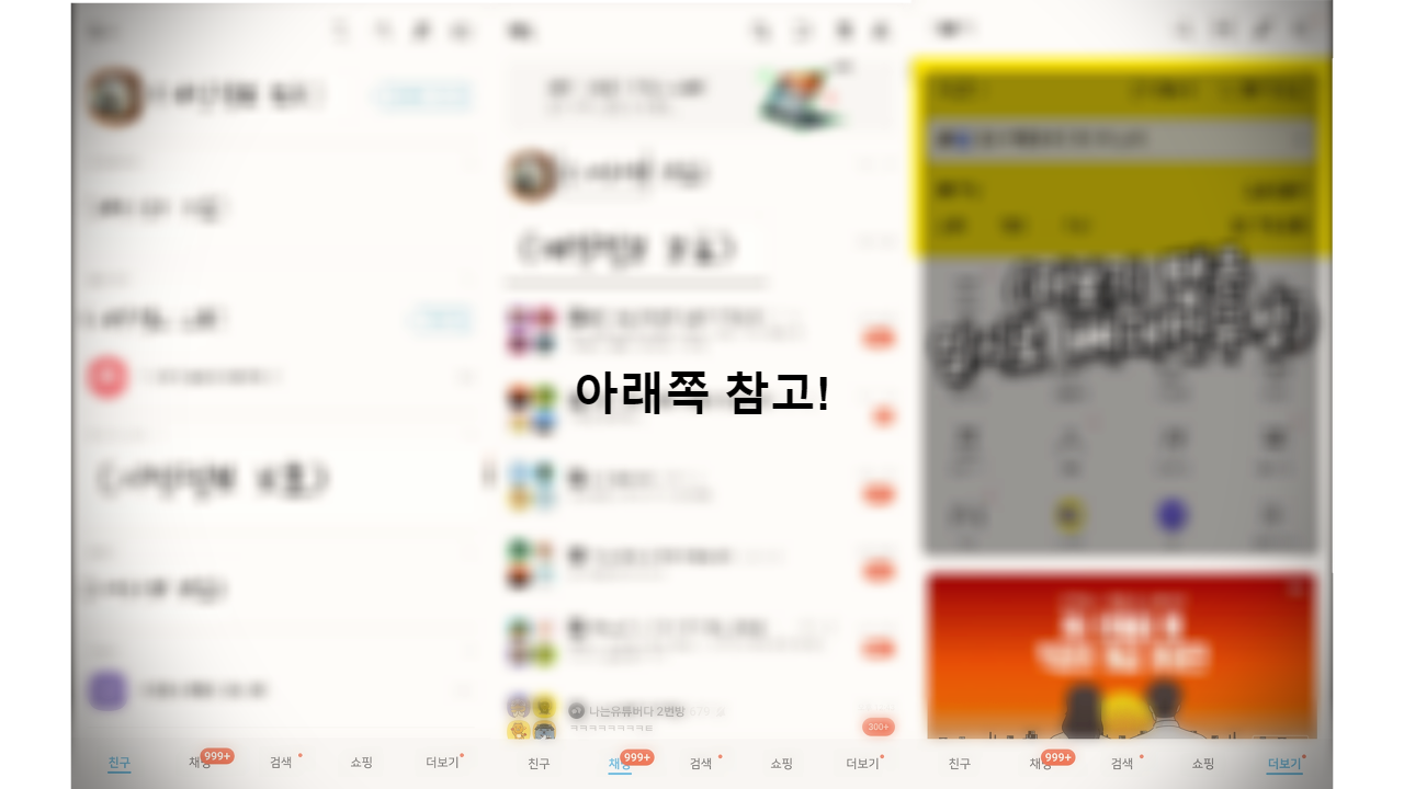 카카오톡 화면의 아래쪽을 보면 친구, 채팅, 검색, 쇼핑, 더보기 등의 버튼이 있다.