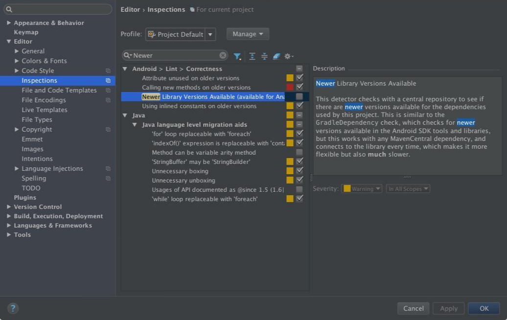 - Android Studio에서 File -> Setting -> Editor -> Inspections에서 Newer를 검색한다.