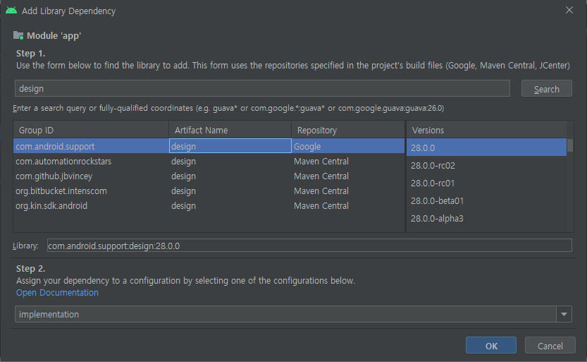 3. Search 란에 design을 검색하고, com.android.support:design으로 되어있는 Library를 클릭, Apply, OK 한다.