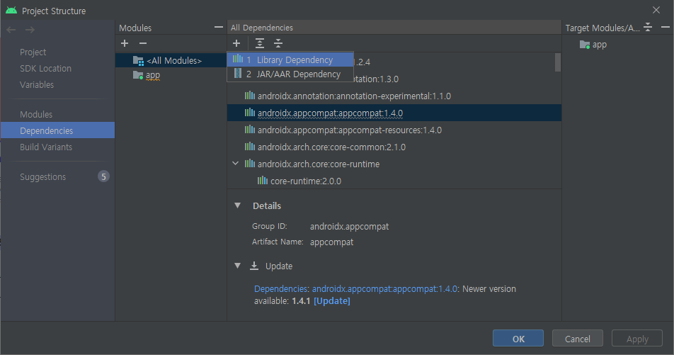 2. All Dependencies 바로 아래 있는 +를 누르고, Library Dependency를 클릭.