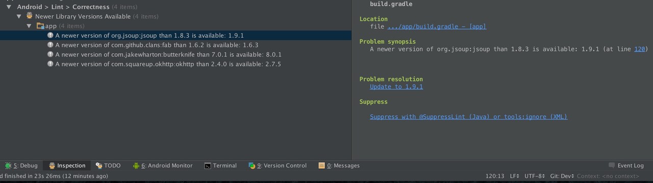- Android Studio에서 외부 라이브러리의 최신 버전을 쉽게 확인할 수 있도록 린트 기능을 제공