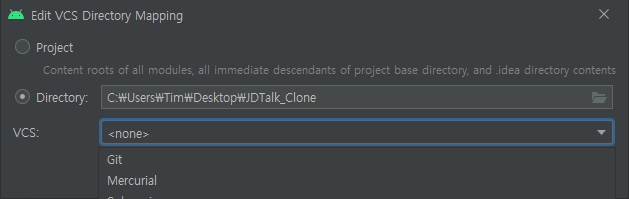 [ VCS ] ▶ [ Git → <none> 으로 변경 ]
