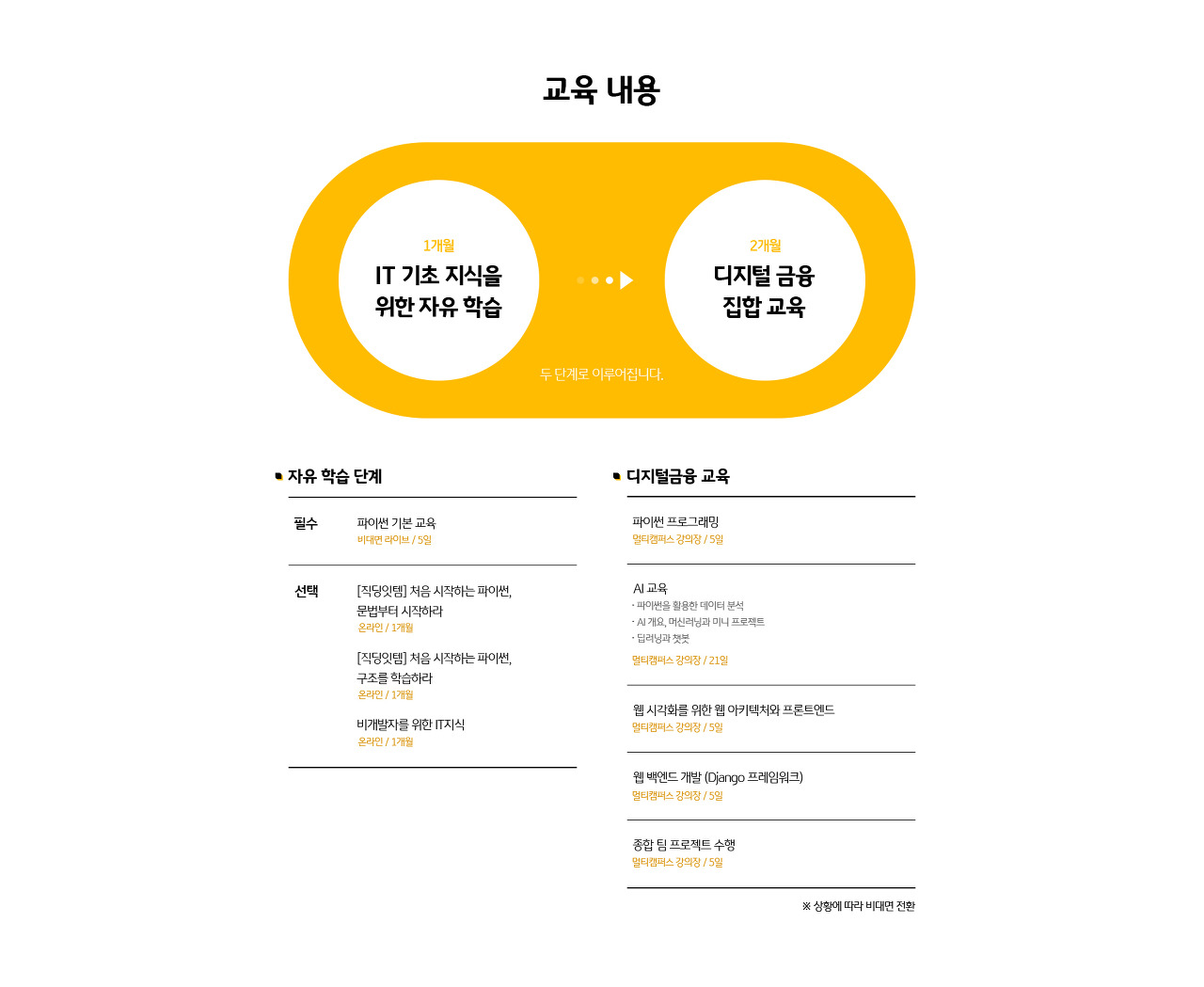 마침 나에게 딱 좋은 기회였다고 생각이 들었던게 금융 관련 IT의 기초 소양을 학습하고, 실무에서 바로 사용 가능한 금융 SW교육을 제공하면서 마지막으로는 팀 단위의 프로젝트를 통해 경험과 스펙을 쌓으면서 포트폴리오를 만들 수 있는 좋은 과정들이라는 생각이 들었다.