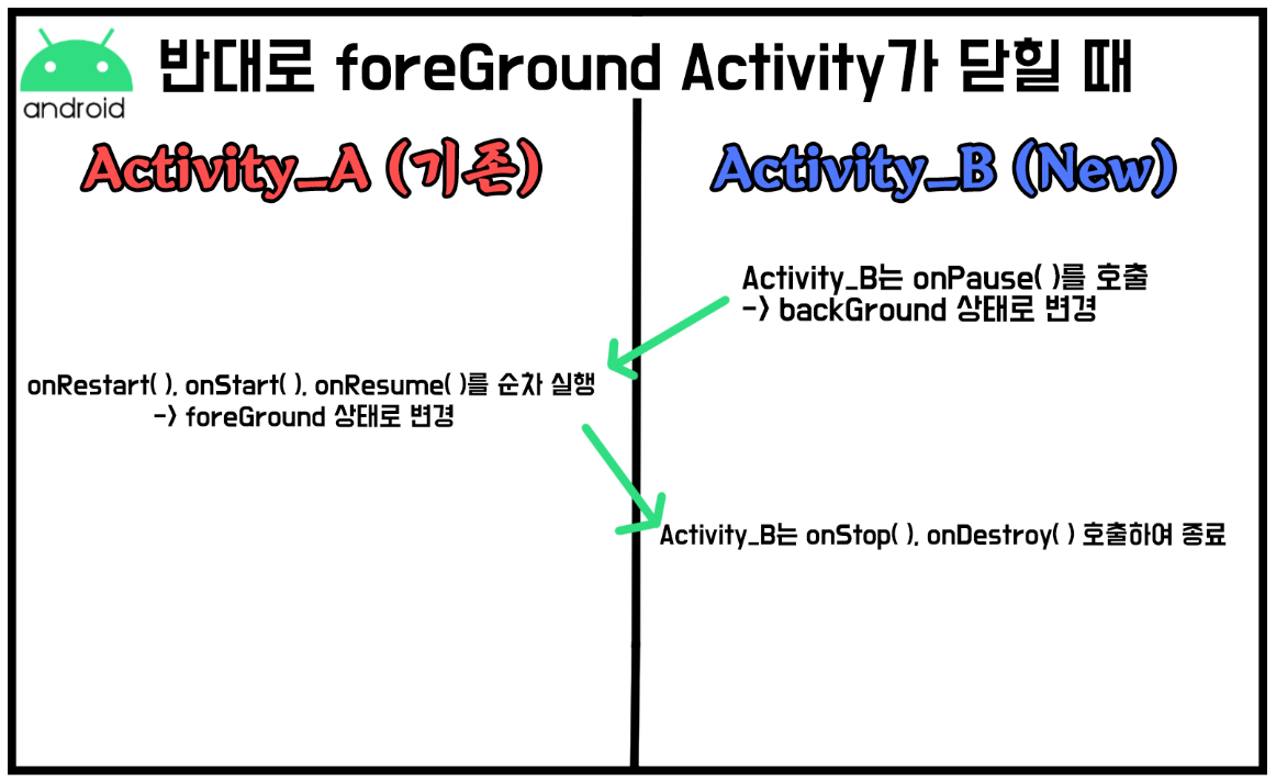 아래 과정은 위의 경우와 반대로, 다른 Activity가 foreGround에서 다시 닫힐 때 기존의 Activity와의 동작 프로세스 과정이다.