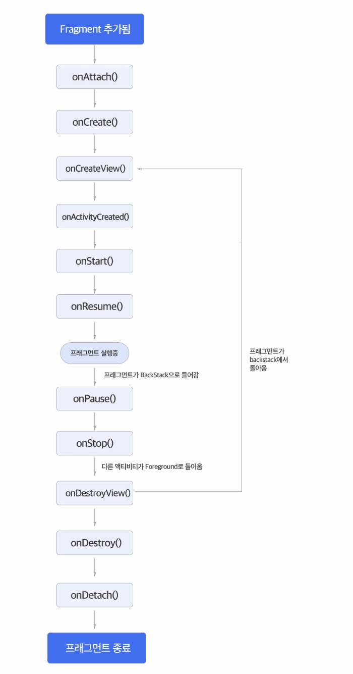 - 이 메소드가 호출된 이후 기존 Fragment가 BackStack에서 돌아오면 onCreateView( )가 호출됨.