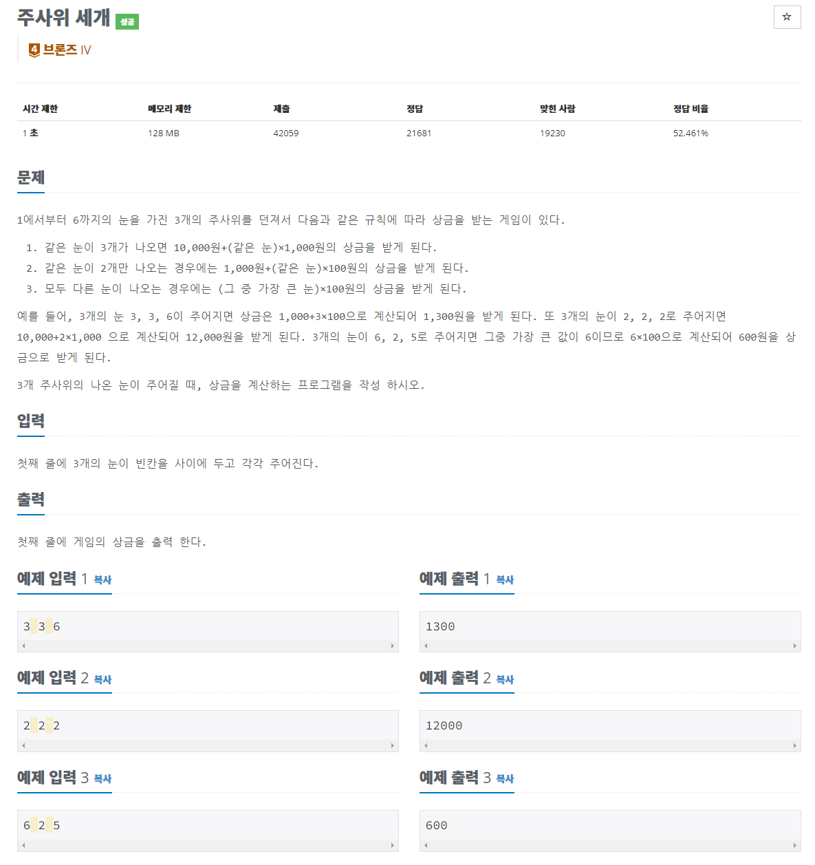 1에서부터 6까지의 눈을 가진 3개의 주사위를 던져서 다음과 같은 규칙에 따라 상금을 받는 게임이 있다. 같은 눈이 3개가 나오면 10,000원+(같은 눈)×1,000원의 상금을 받게 된다. 같은 눈이 2개