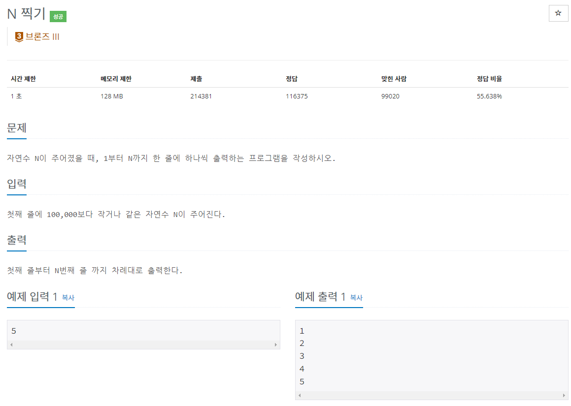for 문을 이용하여 1부터 N까지 단순히 출력해 준 코드이다.