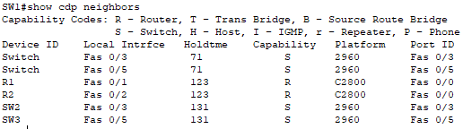 각 장비들이 그림과 같이 연결되어 있는지 show cdp neighbors 명령어를 사용해 확인 해볼 수 있다.