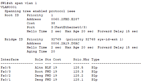 2. SW1의 Fa0/5 링크는 STP에 의하여 데이터 프레임을 송, 수신 할 수 없음.