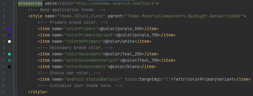 res/values/themes/themes.xml 로 이동하고, <resources /> 태그 내에 새로운 <style /> 태그를 커스터마이징 해 준다.