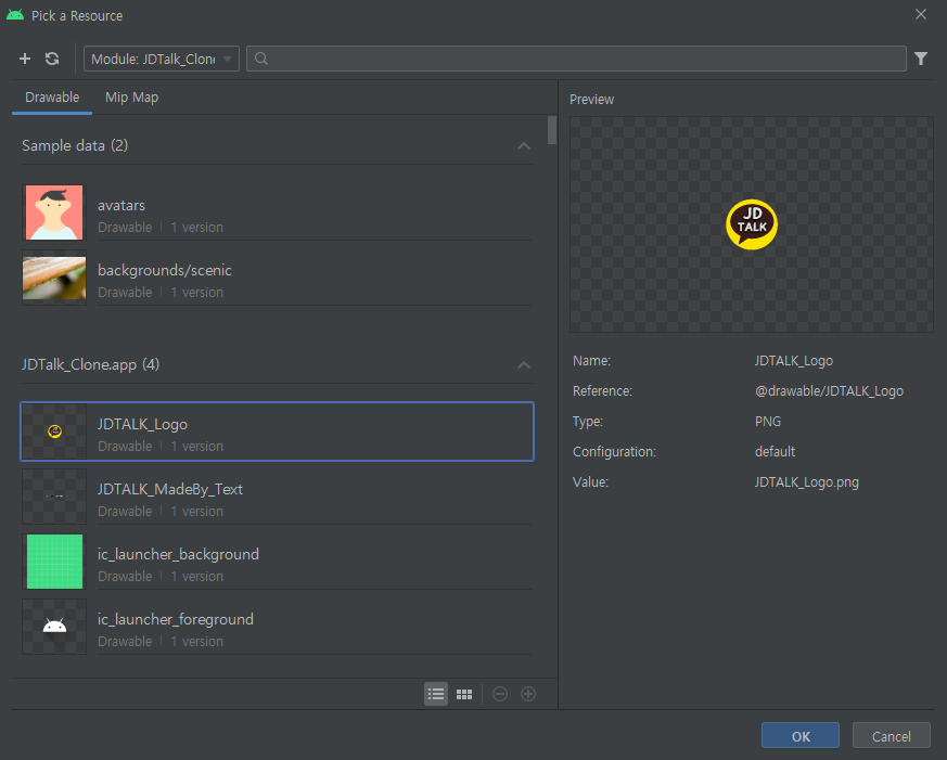 - .xml의 Design 탭에서 ImageView 를 Drag&Drop 해 주면, Pick a Resource 창이 생긴다.