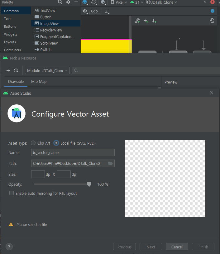 복붙을 하고 나서 ImageView를 xml에 Drag & Drop 하면 추가한 이미지를 선택할 수 있게 된다.