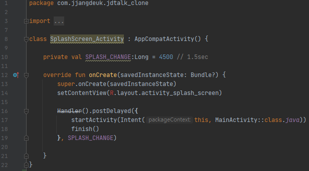 그래서 작성된 MainActivity.kt 와 SplashScreen_Activity의 코드는 아래와 같다.