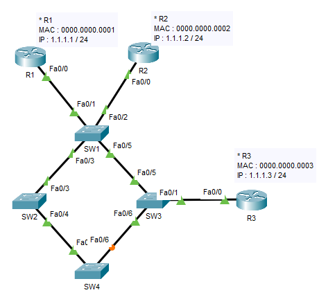 ※ Target : 트랜스패런트 브리징 이해하기. * Step.1 - Switch 에서의 Spanning-Tree Protocol ( ; STP ) 기본 동작 - show cdp neighbors 명령어 이해 - MAC 주소 이해 * Transparent Bridging ? (트랜스패런트 브리징) - Ethernet Switch 가 프레임을 수신하여 목적지로 전송하는 방식과 절차를 정의. (프레임을 참조하여 MAC 주소 테이블을 생성, 갱신, 목적지로 전송할 때 사용) - 사용자가 의식하지 못하게 자동으로 동작 한다는 의미에서 'Transparent (투명한)' 을 사용. Ex 1) Testing Topology * 설정) Router 1, 2, 3 기본 설정 * R1 설정 R1> en R1# conf ..